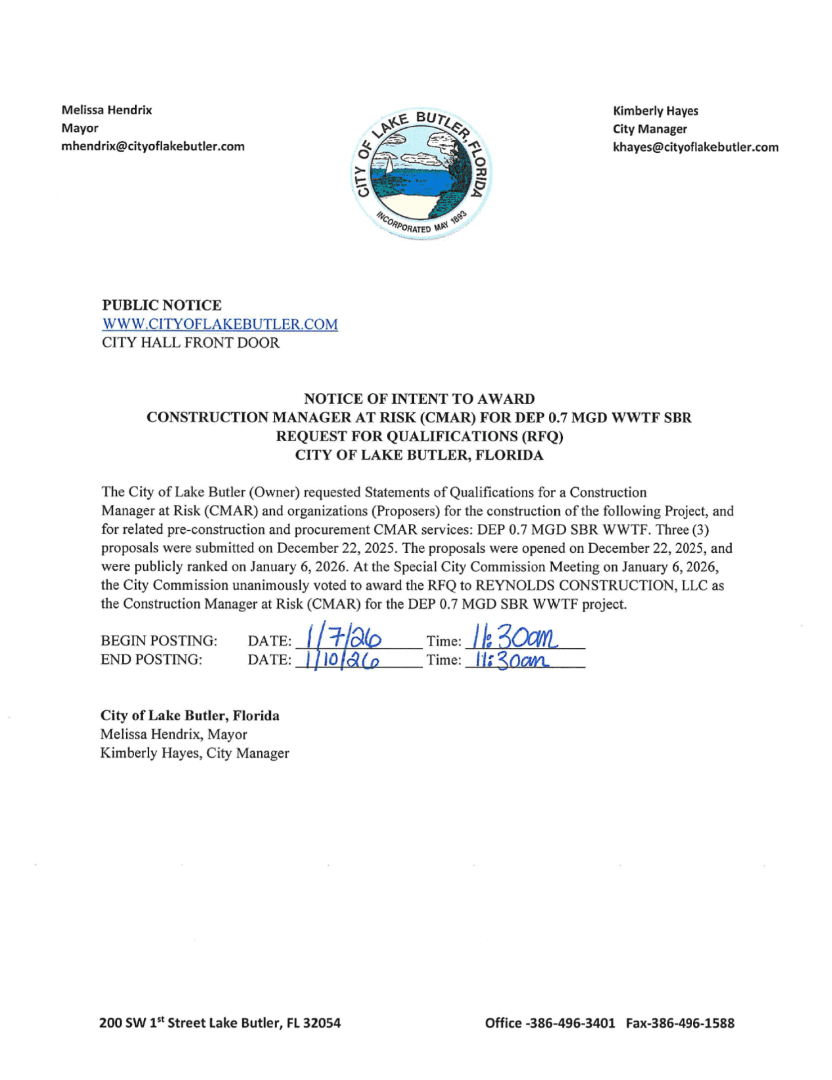 CITY OF LAKE BUTLER GROUND WATER STORAGE TANK REHAB PROJECT 100% COMPLETED: THURSDAY, JANUARY 8, 2026 – 4:04PM